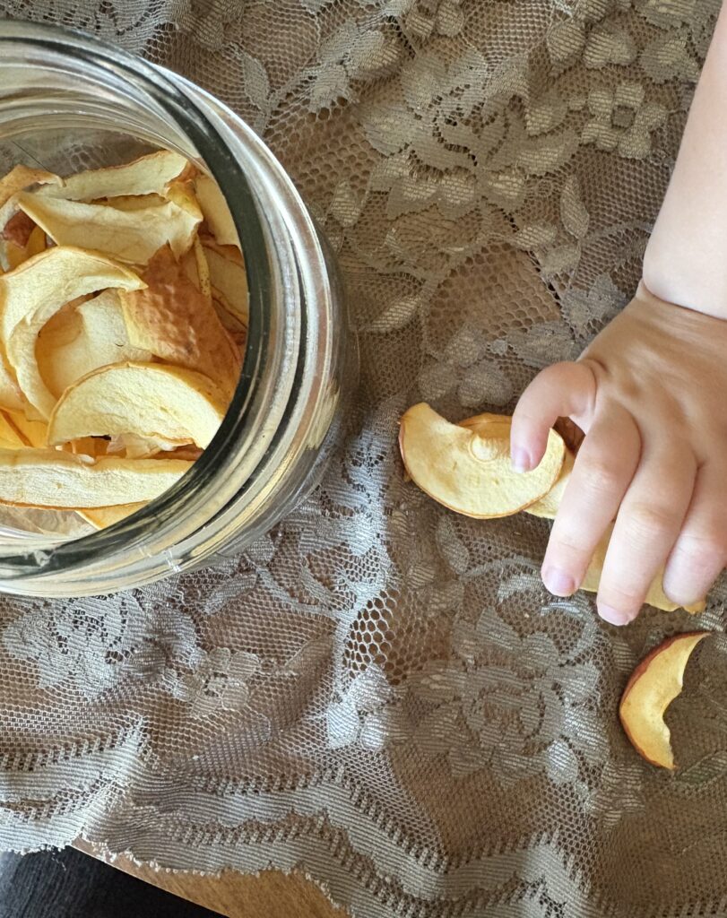To begin, make sure your apples are clean. Cut your slices about 1/4 inch think. We don’t mind the peels, but they do cause the slices to curl up as they dry. Once they’re all sliced up, just place them directly on the dehydrator trays. I don’t use liners for this recipe unless I’m going to sprinkle the slices with cinnamon or sugar. Personally, I don’t prefer to add sugar when I’m making these for the kids, because I think they are sweet enough. But if you add sugar, sprinkle on a couple tablespoons and stir it all up to coat the slices before placing onto the dehydrator trays. Let them dry till they are obviously dry but still soft, or about 8 hours. My oldest is two, and this is what works for us. An additional four hours or so will give you a crunchier apple that’s good for oatmeal or baked goods. I store these up to about 3 days, but they don’t usually last that long with these kids.